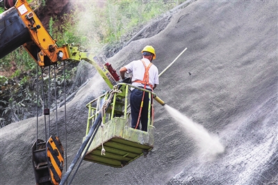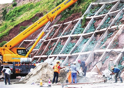 7月15日下午,忠县县城至石宝寨沿江旅游公路三峡橘海路段一边坡加固治理现场,工人在紧张施工。