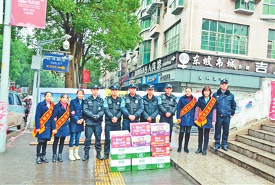 1月14日,重庆家福火锅店负责人陶世琼路过巴王路时发现,民警24小时执勤,非常辛苦,于是决定给民警送去一些物资。1月15日上午,陶世琼安排人员,购买了10箱矿泉水和10箱方便面,送到执勤点。 记者 熊书婷 摄