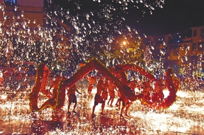 4月20日晚,非物质文化遗产“打铁花”亮相中国橘城田园梦乡——2019年“忠橙”文化旅游节开幕式。