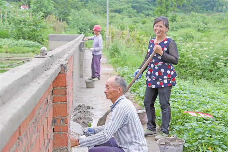 7月7日,几名工人在拔山镇古塘村修建山坪塘防护栏。
