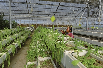 近日,位于新立镇文笔社区的派森百七彩蔬果园内,工人在给蔬菜浇水。