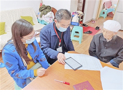 11月2日,忠州街道乐天路社区,普查员利用移动终端填报居民信息。