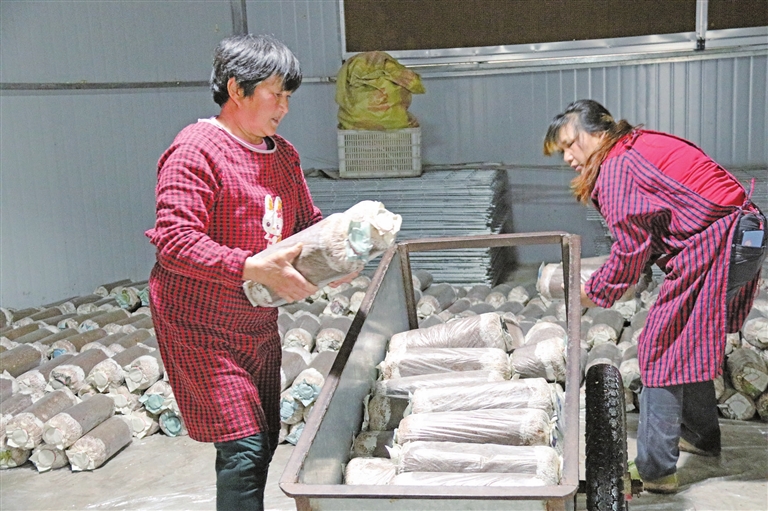 近日,任家镇任家村的食用菌贮存房里,工人在分拣菌包准备送往订购商。