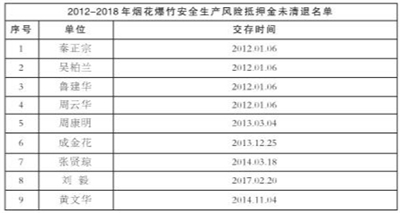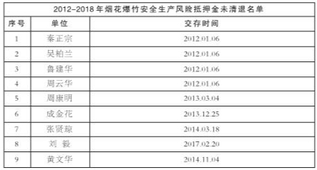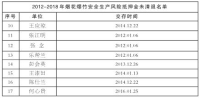从我局开展烟花爆竹经营安全生产风险抵押金清退工作以来,经过乡镇(街道)及烟花爆竹片区代理商多方查找、核实,截至目前,仍有17个经营户无法查找联系,现将相关人员名单予以公示,请列入名单人员于2021年9月12日前,将烟花爆竹风险抵押金缴费凭证、本人身份证复印件(正反面)、银行卡复印件(注明开户行)、村居委证明(需盖章)等资料提交到县应急局危化烟爆科办公室(210室);若凭证遗失的,除以上资料外,还需提供本人申请。