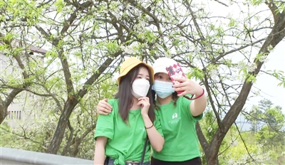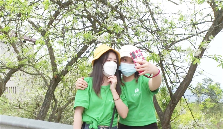 3月19日,游客在黄金镇桃花村李花基地拍照留念。