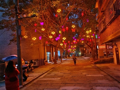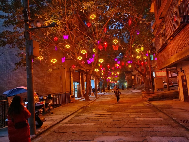 之前,忠州老街沿途空坝上方以悬挂彩色塑料伞为点缀,但造成了落叶等垃圾物在伞面堆积,影响了美观效果。县城市管理局结合实际,征求多方意见,对忠州老街的悬挂点缀物进行升级,改用灯笼、中国结、扇形挂件等替换,不仅环保卫生,还让忠州老街亮了起来。