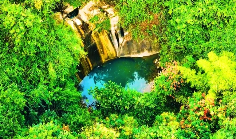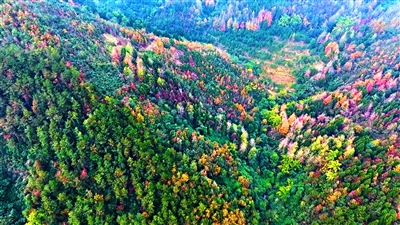 五彩如泼墨,七色抹脂胭。沿着溪流而上,千叶万树,深浅相间,错落有致,令人目不暇接。从空中俯瞰,各色彩林层层叠叠,绵延不绝,与山峦、民居相得益彰,勾勒出一幅多彩的山水田园画卷。