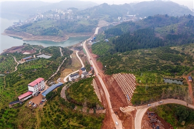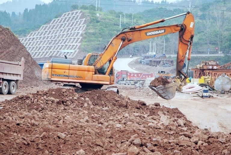 挖掘机机声隆隆,运载车辆川流不息……近日,忠县县城至石宝寨沿江旅游公路灯树社区路段一派繁忙施工景象。