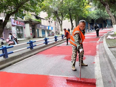 4月7日,县市政园林服务中心组织工人在县城巴王支路与果园路相交的丁字路口铺设彩色抗滑层。