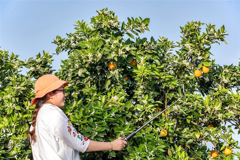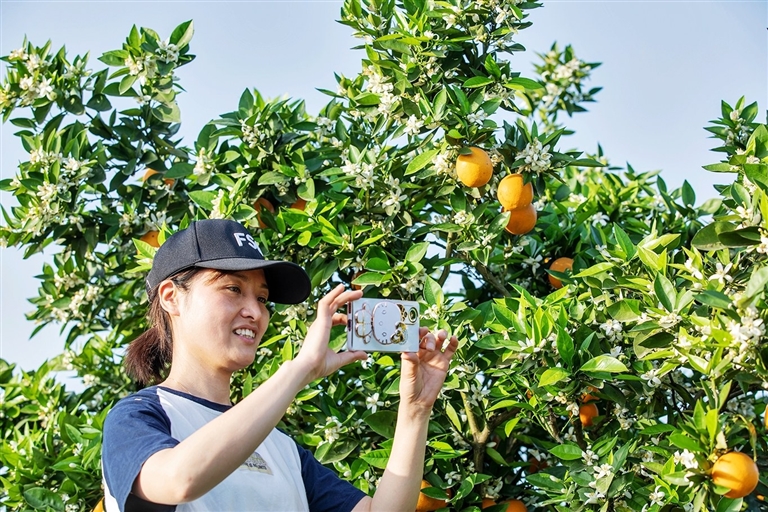橘花绽放、金果压枝……4月15日,三峡橘海再现花果同树美景,吸引众多游人前往游玩赏景。