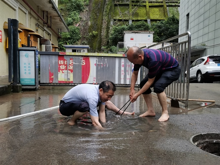 “你们要小心玻璃、碎石,别把手割到了。”7月4日早上,天空下着蒙蒙细雨,县城忠州街道乐天路迎宾大厦小区外,周成波和周世全正徒手疏通下水道,路过的居民纷纷叮嘱他们注意安全。
