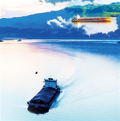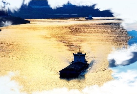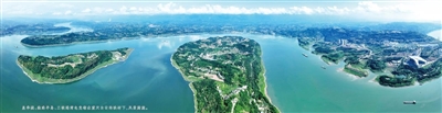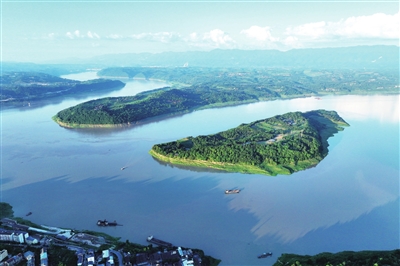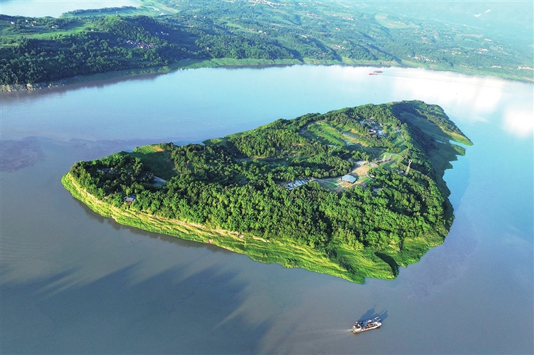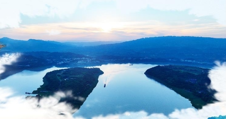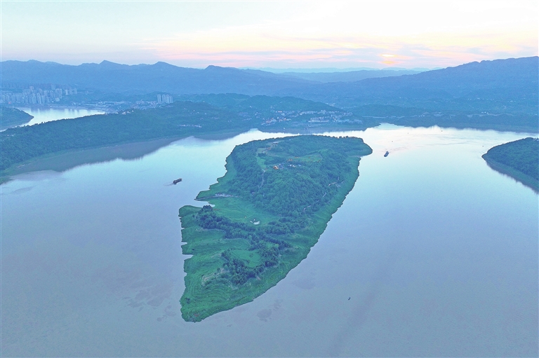 三峡生态岛、千年忠义城。7月5日,忠县皇华城水域晴空万里,水天一色,浩荡长江、巍巍青山、蓝天白云、江中孤岛相映成画。傍晚时分,夕阳缓缓西坠,万丈霞光铺满江面。船舶驶过,泛起道道金色的涟漪。暮色渐深,紫霞缓缓隐退,江滩、山村、岛屿薄雾萦绕,好一幅恬静美好的江村风情图。