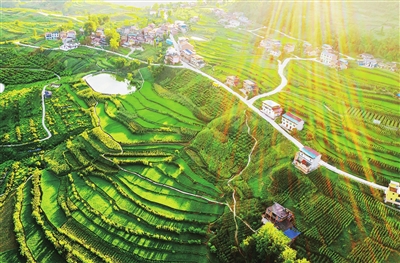 7月17日傍晚,在夕阳映射下,涂井乡万顺村层层叠叠的稻田五彩缤纷,宛若一幅彩色画卷。