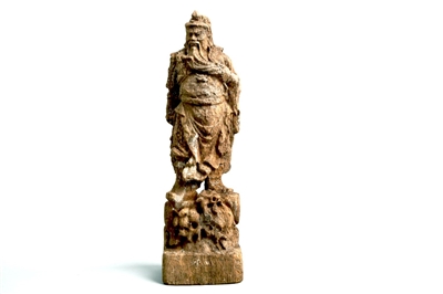 此件木雕关公立像通高29厘米,像高25.5厘米、宽8.1厘米,底座长8.3厘米、宽6.8厘米、高3.5厘米。木雕所刻关公顶戴青巾皂角帽,身着追云战袍,右手持青龙偃月刀(刀已遗失)于身后,左手于胸前抚美髯,双脚前后分离站姿,身形挺拔,面相凝重,浑身威武正气。经文保中心工作人员初步推测,此件木雕关公立像年代应在晚清至民国,具体情况需市文物局组织专家进一步鉴定。