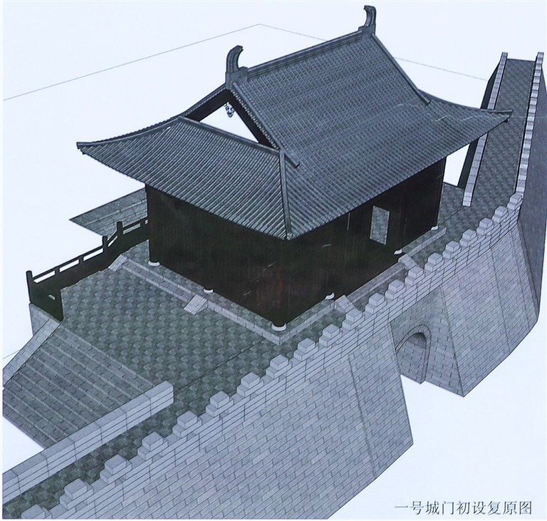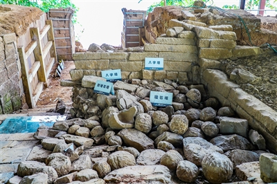 目前考古发现了皇华城的4座城门,其中与顺溪渡隔江相望的城门最先发掘,被称为“陶家嘴一号城门遗址”。从发掘现场可以看出,这座城门坐东朝西,平面呈“凸”字形,由外门道、内门道、八字墙、阶梯踏道、排水暗沟等部分组成,内门道墙壁上贴有方形石砖,城门内堆有大量足球大小的礌石。考古发现,一号城门遗址与目前发现的南宋山城体系其他30多座城池的城门相比,具有三大特色:一是结构完整、要素齐全,规模体量最大,保存最完整;二是城门设计复杂,内外门道分别为排叉柱城门、拱券顶城门,同一座城门出现两种形制,非常罕见;三是考古发掘的封堵石墙和礌石堆,印证了元军毁城的历史真实性。