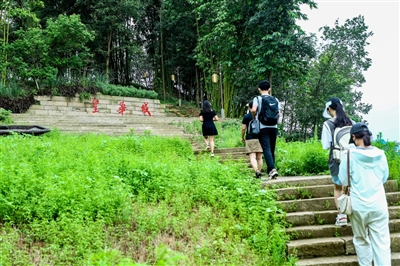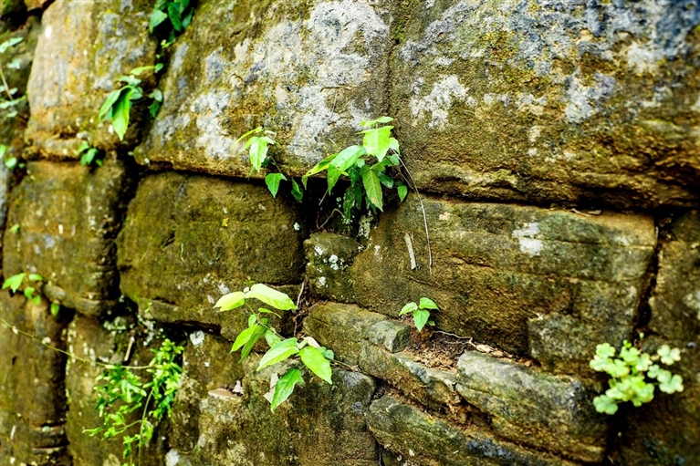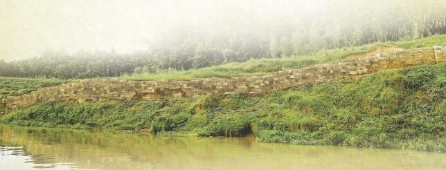 一道城墙赫然入目,以夯土条石临崖而筑,依山就势沿江延伸,青苔覆面、杂草填缝,沧桑历历,令人感叹。据考古推测,这是皇华城的内城墙,长约800米。咸淳元年(1265年),忠州升咸淳府,迁治于此,“环江为壕,据岛为城”,筑就内外城墙和南北一字城墙,以御元军入侵。三峡工程修建后,水位上升,外城墙早已隐于水下。在与城墙相邻的半坡平台处,一块遗址标志碑立于台前,“皇华城”三个行书大字刻于条石砌筑的形象墙上,字体丰润、笔画舒展,乃取北宋大文豪苏轼书法字体组合而成。