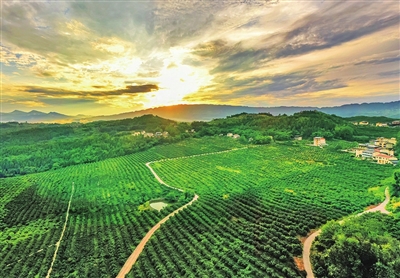 9月2日,从空中俯瞰濒临长江的涂井乡友谊村,成片的柑橘树整齐划一、苍翠茂盛,呈现出一江碧水、两岸青山的生态美景。