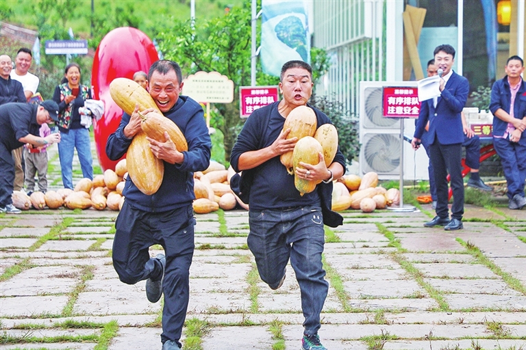 智慧农业园大棚内,游客们兴趣盎然,轮流上阵体验打糍粑,一起庆祝岁物丰成,分享中秋到来的喜悦。大棚外的小广场上,游客们争相报名参加搓包谷、运南瓜、开龙门、抓土鸡、捡鸡蛋等趣味农事活动,现场欢声笑语一浪高过一浪。