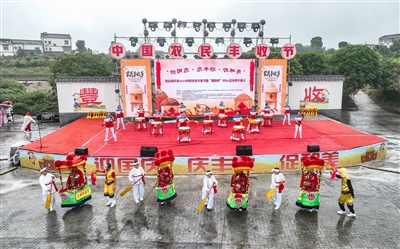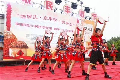 震天的锣鼓敲起来,欢快的舞蹈跳起来,悦耳的歌声唱起来……9月25日,拔山镇庆祝2023年中国农民丰收节暨“朝阳杯”村BA篮球赛开幕式在阿金河乡村公园举行,来自县内外2000余名游客和当地农民群众迎着秋日细雨,共同欢庆丰收。