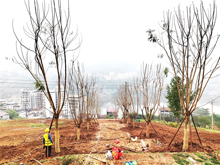 10月24日,忠县香山体育公园内,园林工人在拟建的景观步道两旁植树。
