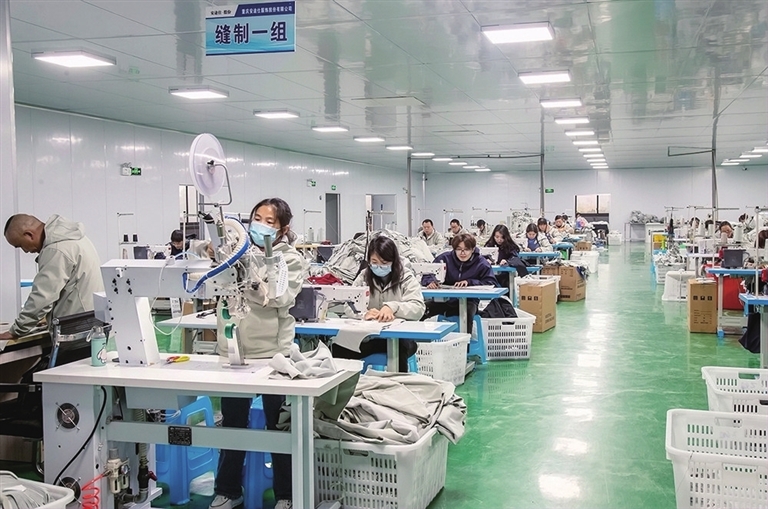 12月13日,重庆安途仕服饰股份有限公司生产车间,数十名工人在紧张加工。