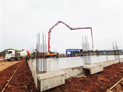 2月25日,记者在县工业园区华聚机械项目施工现场看见,工人正使用水泥罐装车等设备进行基础浇筑。工地上车来车往,一派繁忙的场景。