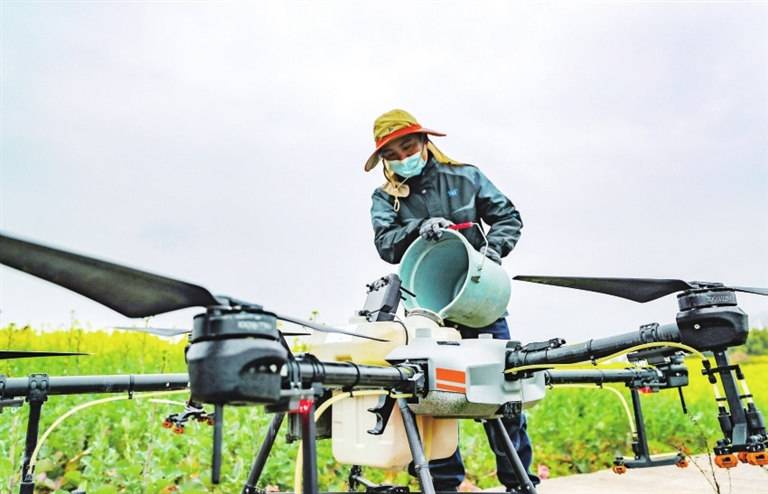 装水、起飞、喷洒……2月26日,马灌镇灌湖水乡油菜基地,伴随着阵阵螺旋桨的嗡鸣声,两架大疆T30植保无人机快速升空喷洒,不到半天就完成300余亩油菜喷施化肥的任务。