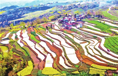 近日,在春日暖阳照射下,涂井乡万顺村一块块冬水田与彩色农作物交相辉映,绘就出一幅幅五彩缤纷的山水画卷。