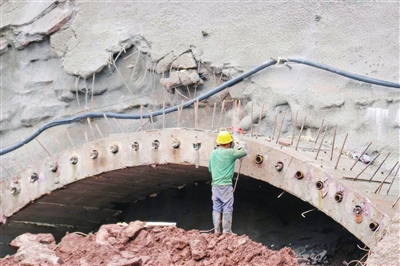 10月21日,忠县城区㽏井河库岸综合整治工程(西段)环湖路建设现场,工人在加紧施工。