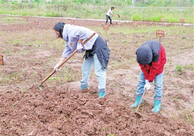 活动中,除草、翻土、播种、施肥……孩子们在家长和老师的带领下,专注地投入到农耕劳作中。图为一对母子在劳作。