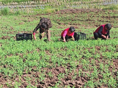 10月28日,拔山镇八德村集体经济豌豆尖种植基地,村民在采收豌豆尖。