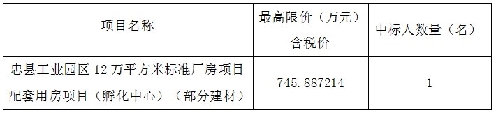中科旭日建设集团有限公司(以下简称:采购代理机构)受重庆市忠瑞建筑工程有限公司(以下简称:采购人)的委托,对忠县工业园区12万平方米标准厂房项目配套用房项目(孵化中心)(部分建材)进行公开采购,欢迎有资格的供应商参加投标。