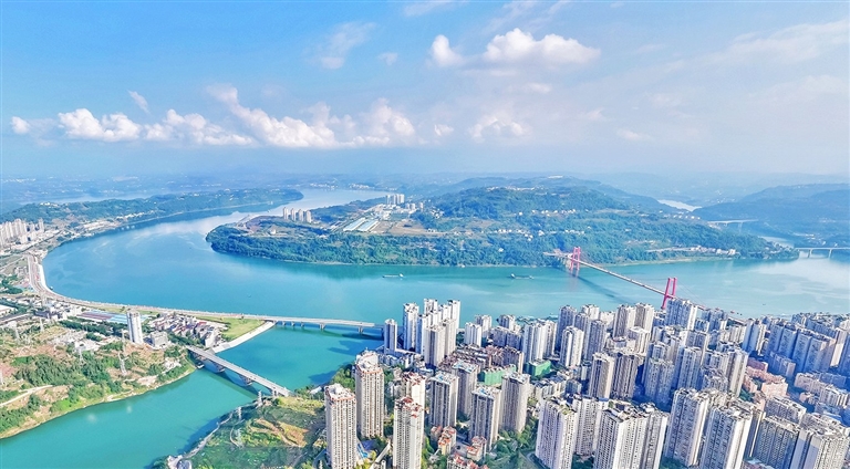 近日,长江重庆忠县㽏井口呈现出河清岸绿、山水环抱的独特景观,美不胜收。