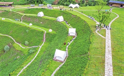 2022年,忠县开展全域土地整治,对30亩“烂泥湾”进行治理,通过固土、覆绿等措施,这片土地如今已“身穿绿衣”,成为居民举办音乐节、草坪婚礼的好地方。靠近江边的坡坎被修复成一个个台阶,搭上帐篷就是露营基地。入眼满是绿色,扑面全是凉风,好不惬意。看着环境好了,老百姓也给它改了个名字:兰尼湾。