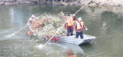 2月11日,马灌镇石河水库,金土公司20余名员工在进行水库道路施工、库周杂草及沉积物清理等工作。