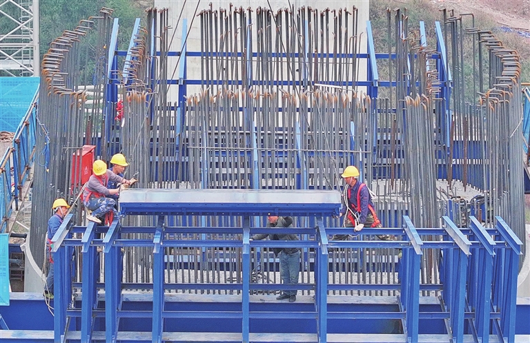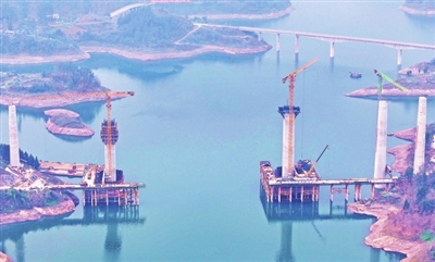 3月2日,渝万高铁忠县段㽏井河双线特大桥建设现场,该桥梁关键节点7号主墩、8号主墩施工快速推进,为在8月底之前完成边跨合龙提供了工期保障。