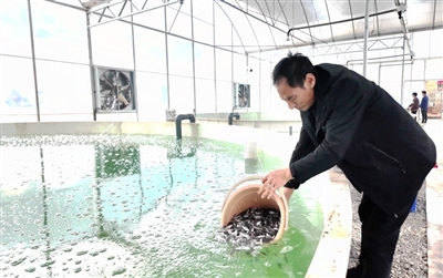 3月13日,位于忠州街道独珠村的鱼菜共生工厂化养殖基地投放今年首批5万尾鲈鱼苗。