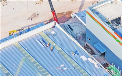 5月10日,重庆市忠县国家现代农业产业园多温冷库钢结构厂房建设现场,工人在对屋顶进行收边收口施工。