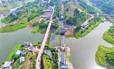 近日,在渝万高铁忠县段南溪村双线特大桥建设现场,一派繁忙施工景象。