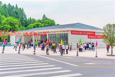 6月6日农副产品销售中心运行那天,村民们背着水果、蔬菜等农副产品,乐呵呵地从四面八方来“赶集”。兴旺村老党支部书记向儒学摸着光洁的墙面,声音哽咽道:“终于建成喽,黄书记让我们村的农产品有地方‘出嫁’喽!”