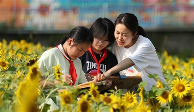 6月份以来,石宝寨景区的向日葵、格桑花大面积开放,一望无际的花海与一江碧水、两岸青山共同构成一幅壮美的山河画卷,吸引众多游人前来拍照、写生。