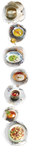 (2)猪骨切块焯水,把黄豆、瑶柱、生姜一起放入锅内加清水熬汤1小时成高汤;