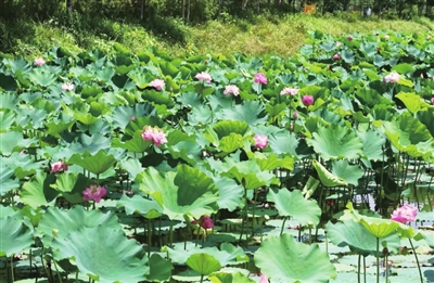 这段时间,拔山镇阿金河乡村公园3万余株富贵莲迎来盛花期,吸引游客前往观赏打卡。