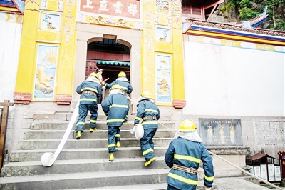 塔楼工作人员发现火情后,第一时间通知景区负责人和石宝镇消防队。景区应急救援人员火速赶到事发楼层,指导游客用湿毛巾捂住口鼻,沿着安全通道快速有序撤离,同时将一名晕倒的游客用担架抬到安全地带。石宝镇消防队员抵达现场后,立即接通消防水源利用高压水枪喷水灭火。经过大家协同作战,大火很快被扑灭。 记者 余鸿 摄