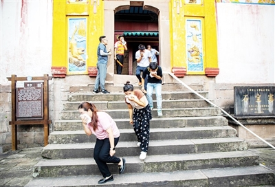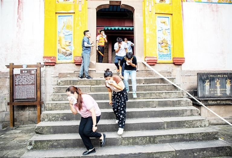 上午8点30分,消防警报响起,消防疏散逃生综合实战演练开始。此次演练模拟石宝寨塔楼2层突发火情,浓烟蔓延导致游客被困。