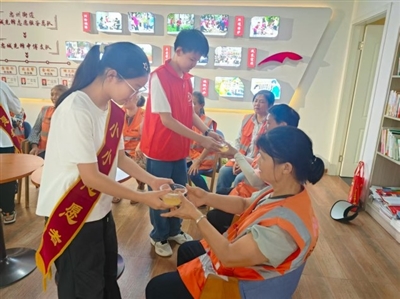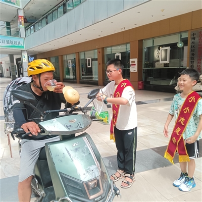 当天,社区暑期托管班的小小志愿者们在社区工作人员带领下,将冰镇绿豆汤、藿香正气水等防暑物品逐一送到辖区内的环卫工人、快递员、外卖骑手等户外工作者手中,感谢他们在高温下为社区环境整洁和居民生活便利付出的辛勤努力。同时,志愿者们还邀请户外工作者到社区活动室休息纳凉,叮嘱他们注意防暑降温。