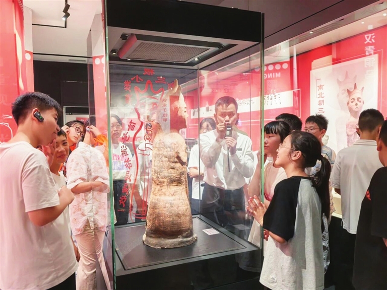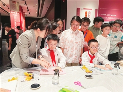 临展厅内,讲解员用生动的语言,将文物的发掘过程、修复细节与历史背景娓娓道来,学生们驻足凝视、轻声交流,充满对历史的敬畏与探索欲。观展结束后,学生们在工作人员的指导下,体验了纹饰拓印和木版年画、创意徽章制作,在实践中触摸历史、感知匠心。