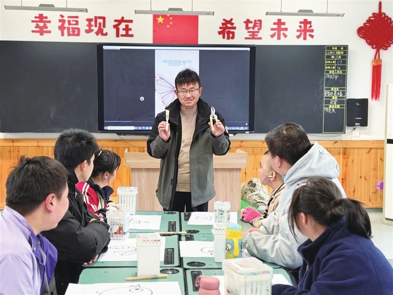 12月15日,忠县特殊教育学校教室内,忠县文化馆工作人员为该校特殊儿童讲解树枝粘贴画的基本创作方法,指导孩子们利用自然树枝搭配创作素材。