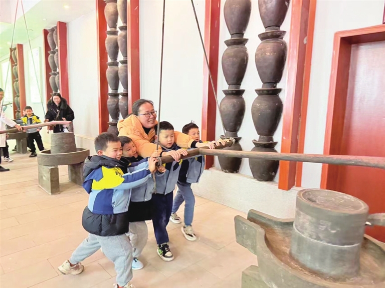 图为孩子们在家长的带领下体验传统石磨推豆腐。
